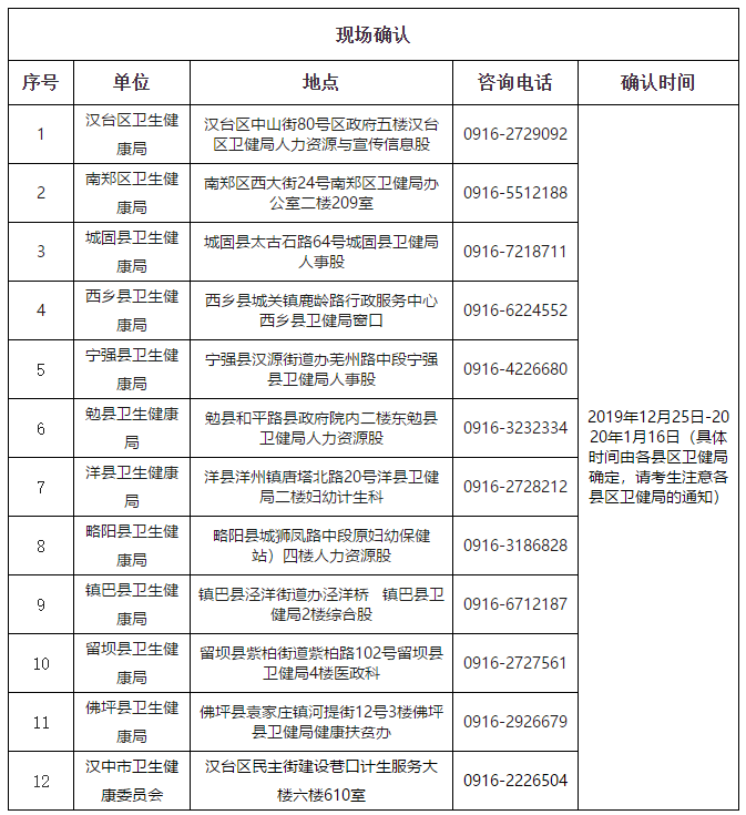 (3)漢臺(tái)區(qū)轄區(qū)內(nèi)除市中心醫(yī)院、三二0一醫(yī)院、市鐵路中心醫(yī)院、漢中療養(yǎng)院、市疾控中心、漢中職業(yè)技術(shù)學(xué)院附屬醫(yī)院、西安醫(yī)學(xué)院附屬漢江醫(yī)院、市中心血站、市婦幼保健所、市復(fù)退軍人精神病康復(fù)醫(yī)院、市福利院附屬民康醫(yī)院的其他所有公立醫(yī)療衛(wèi)生單位和考生檔案在市、區(qū)人才交流中心管理的非公立醫(yī)療衛(wèi)生單位均由單位人事部門統(tǒng)一到漢臺(tái)區(qū)衛(wèi)健局報(bào)名點(diǎn)進(jìn)行現(xiàn)場(chǎng)確認(rèn)。