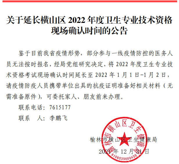 關(guān)于延長(zhǎng)橫山區(qū)2022年度衛(wèi)生專業(yè)技術(shù)資格現(xiàn)場(chǎng)確認(rèn)時(shí)間的公告
