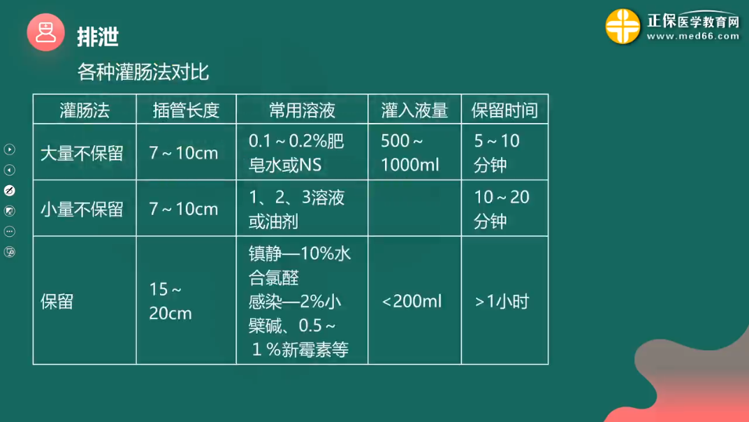 這三種灌腸法的目的、使用的溶液、肛管插入的深度、保留的時間等等都不相同,但又很相似,記憶起來很容易混淆,所以,網(wǎng)校老師在課程中用表格進行了對比總結(jié),讓大家對著三種灌腸法的區(qū)別“一目了然”,一起來看看吧。