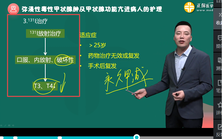 放射性碘是指利用131I釋放的β射線破壞甲狀腺腺泡上皮,減少甲狀腺素的合成與釋放。
