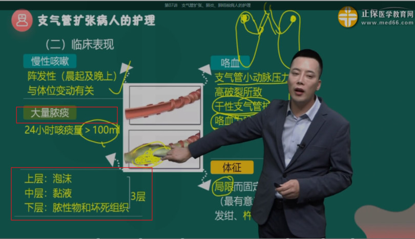 支氣管擴張癥患者通常會咳大量膿痰,痰液靜置后可分3層:上層為泡沫、中層為黏液、下層為膿性物和壞死組織,伴有厭氧菌感染時痰液惡臭。