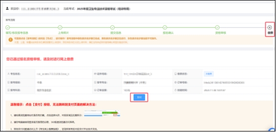 點擊報考流程中的【繳費】節(jié)點,核對報考專業(yè)科目和金額,確認(rèn)無誤后,點擊“支付”按鈕跳轉(zhuǎn)至考區(qū)指定的繳費平臺進行支付。完成繳費后【繳費】節(jié)點變?yōu)榫G色,表示報名成功。
