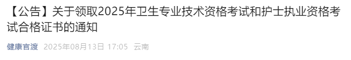 2025年度衛(wèi)生專業(yè)技術資格考試及護士執(zhí)業(yè)資格考試合格證書已可以領取。凡在官渡區(qū)衛(wèi)生健康局報名審核點(官渡街道社區(qū)衛(wèi)生服務中心)進行現場審核的考生,請按以下要求領取證書:
