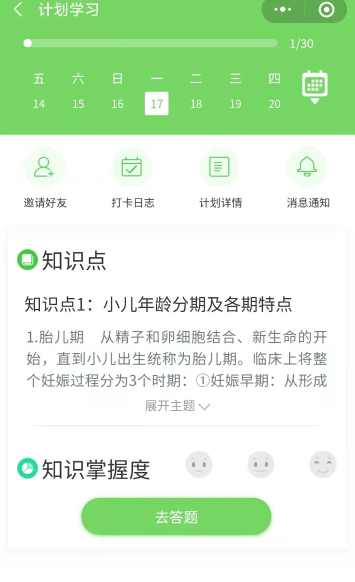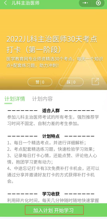 第三步:請選擇“您的備考計劃”,如“2022兒科主治醫(yī)師30天考點(diǎn)打卡(第一階段)”,點(diǎn)擊下方“加入計劃開始學(xué)習(xí)”