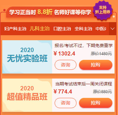 活動(dòng)期間購(gòu)買兒科主治醫(yī)師考試輔導(dǎo)課程可以享受8.8折優(yōu)惠,可以與學(xué)費(fèi)紅包同享,立享折上折!