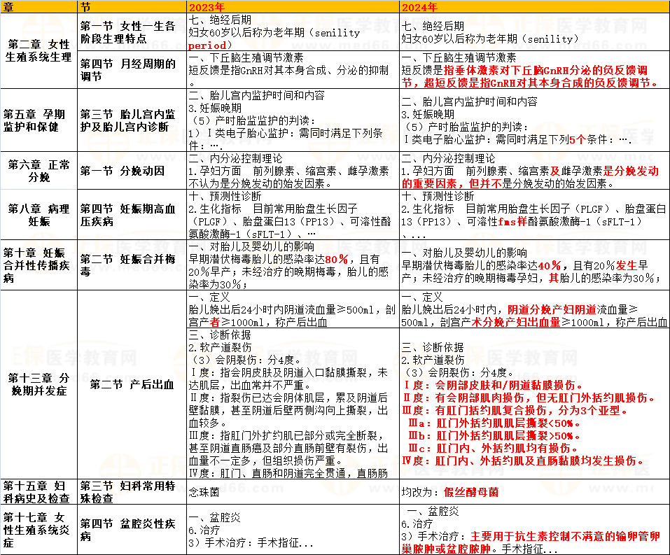 2024年婦產(chǎn)科主治醫(yī)師考試教材公布了,經(jīng)醫(yī)學(xué)教育網(wǎng)專業(yè)教務(wù)校對發(fā)現(xiàn)了部分變動,具體內(nèi)容如下 :