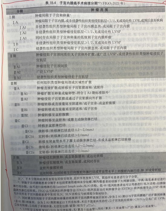 2023:目前被國(guó)內(nèi)外廣泛使用的子宮內(nèi)膜癌分期體系是FIGO于2009年推薦使用子宮內(nèi)膜癌手術(shù)病理分期系統(tǒng),見(jiàn)表18-3。
