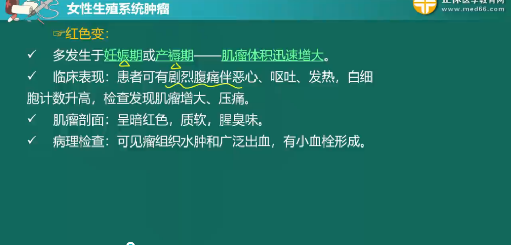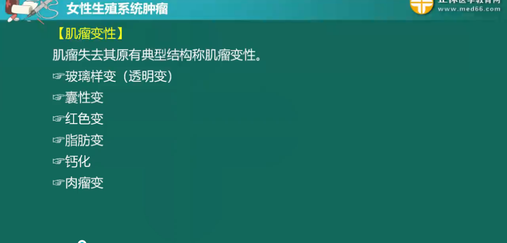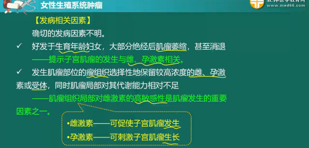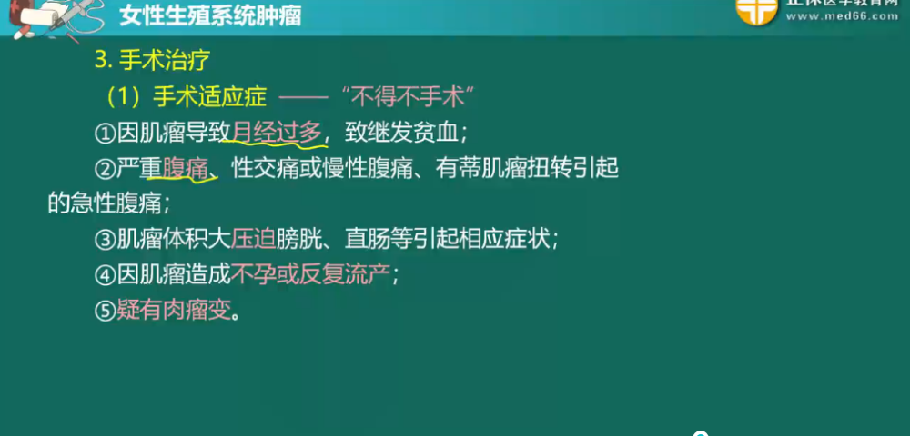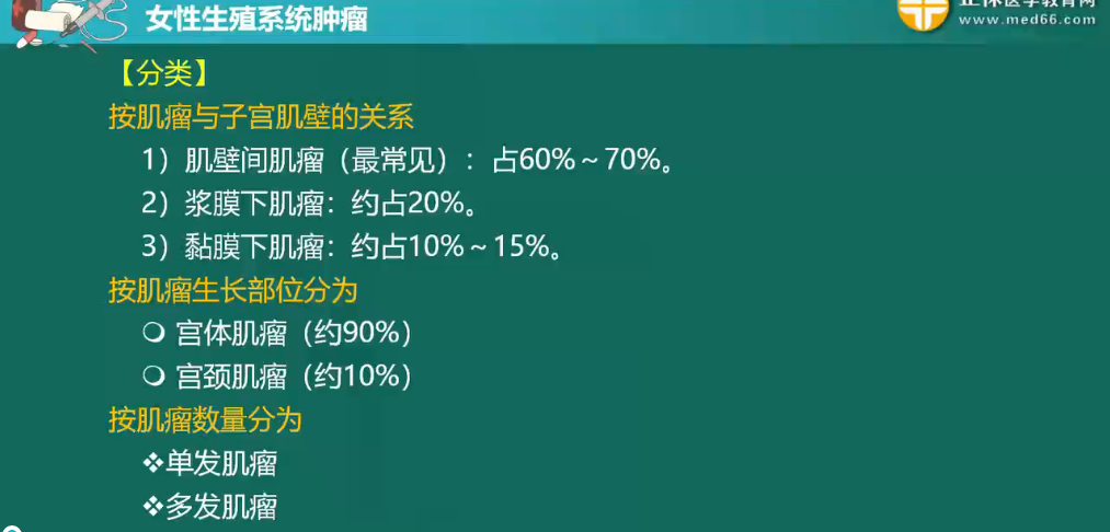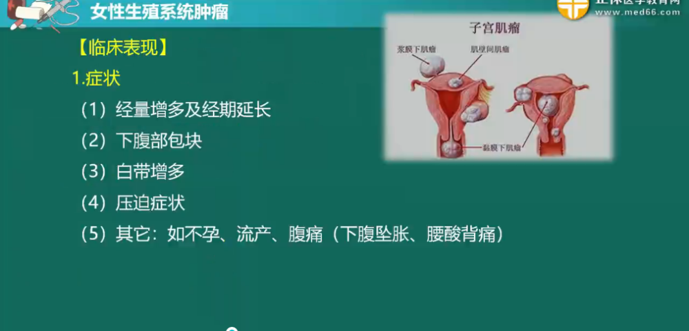 詳情子宮肌瘤是生殖系統(tǒng)最常見的良性腫瘤,由平滑肌和結(jié)締組織組成,以平滑肌為主。子宮肌瘤的臨床癥狀取決于肌瘤的部位、大小、生長速度、有無繼發(fā)性改變等因素,與腫瘤數(shù)目關系不大。此部分內(nèi)容相對簡單,但還是需要大家做到熟練掌握,盡量不丟分。