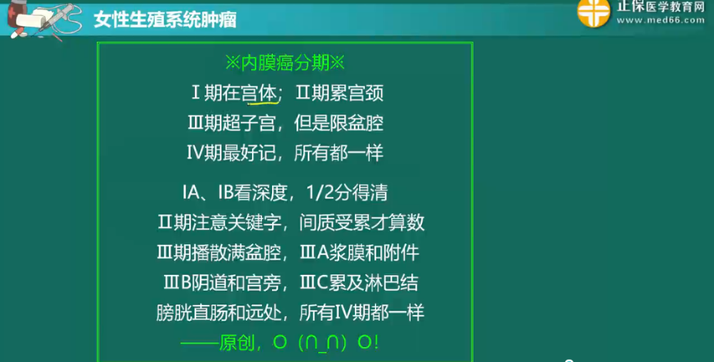 內(nèi)膜癌分期記憶法:Ⅰ期在宮體;Ⅱ期累宮頸。Ⅲ期超子宮,但是限盆腔。Ⅳ期最好記,所有都一樣。