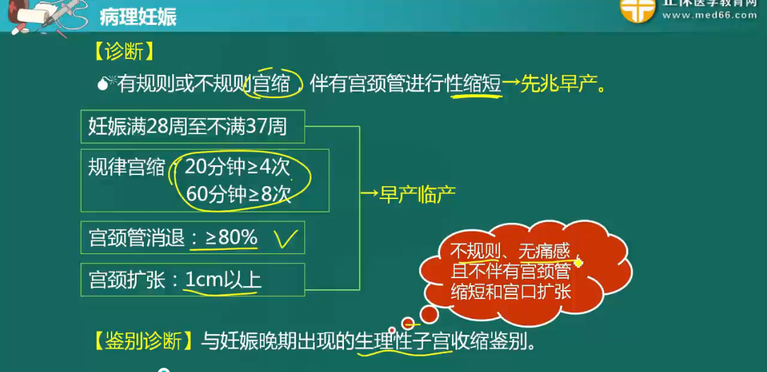 早產(chǎn)是指妊娠滿(mǎn)28周至不足37周(196~258日)間分娩者。早產(chǎn)占分娩總數(shù)的5%~15%。此時(shí)娩出的新生兒稱(chēng)為早產(chǎn)兒,體重為1000~2499g,各器官發(fā)育尚不夠健全,存活率低下。在婦產(chǎn)科主治醫(yī)師的考試中病因會(huì)在科目二中考察,臨床表現(xiàn)及診斷和治療會(huì)在科目三中考察到。需要學(xué)員靈活掌握。