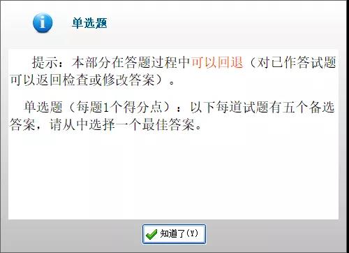系統(tǒng)提示在單選題答題過程中可以回退、檢查或修改答案。