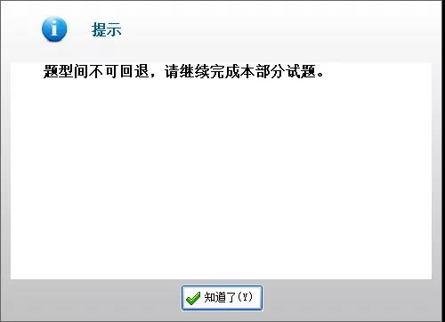 第一部分(單選題)的題目沒有做完,是不可以做第二部分的哦。會提示“題型間不可退,請繼續(xù)完成本部分試題”。