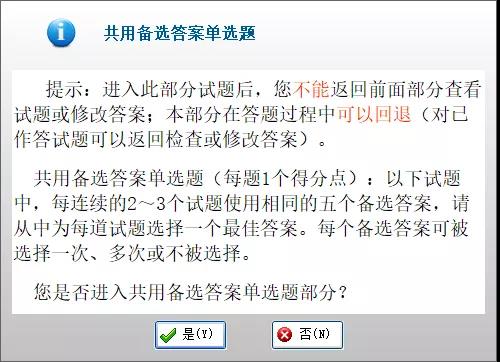進(jìn)入下一部分時會提示你不能修改上一部分(如由單選題到共用題干單選題)。也就是說,當(dāng)你進(jìn)行下一部分內(nèi)容的時候,之前的答案已經(jīng)不可以修改了,所以各位考生作答時一定要慎重考慮!
