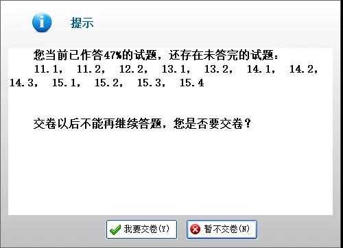 仍有試題未作答完畢,點擊“交卷”后,會彈出如下對話框。