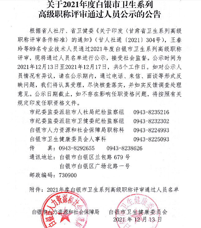 白銀市人力資源和社會保障局發(fā)布關于2021年度白銀市衛(wèi)生系列高級職稱評審通過人員公示的公告,醫(yī)學教育網整理具體內容如下: