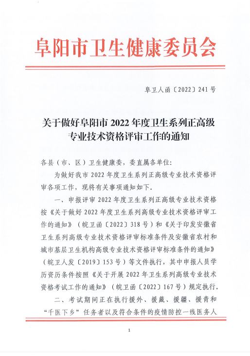 關(guān)于做好阜陽市2022年度衛(wèi)生系列正高級(jí)專業(yè)技術(shù)資格評(píng)審工作的通知