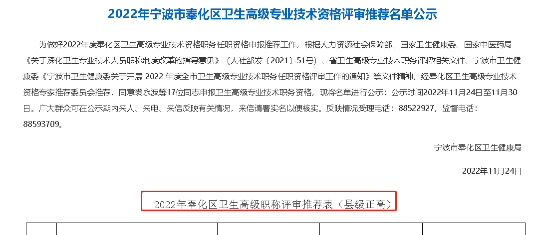 為做好2022年度奉化區(qū)衛(wèi)生高級專業(yè)技術資格職務任職資格申報推薦工作,根據(jù)人力資源社會保障部、國家衛(wèi)生健康委、國家中醫(yī)藥局《關于深化衛(wèi)生專業(yè)技術人員職稱制度改革的指導意見》(人社部發(fā)〔2021〕51號)、省衛(wèi)生高級專業(yè)技術職務評聘相關文件、寧波市衛(wèi)生健康委《寧波市衛(wèi)生健康委關于開展 2022 年度全市衛(wèi)生高級專業(yè)技術職務任職資格評審工作的通知》等文件精神,經(jīng)奉化區(qū)衛(wèi)生高級專業(yè)技術資格專家推薦委員會推薦,同意裘永波等17位同志申報衛(wèi)生高級專業(yè)技術職務資格,現(xiàn)將名單進行公示:公示時間2022年11月24日至11月30日。廣大群眾可在公示期內來人、來電、來信反映有關情況,來信請署實名以便核實。反映情況受理電話:88522927,監(jiān)督電話:88593709。
