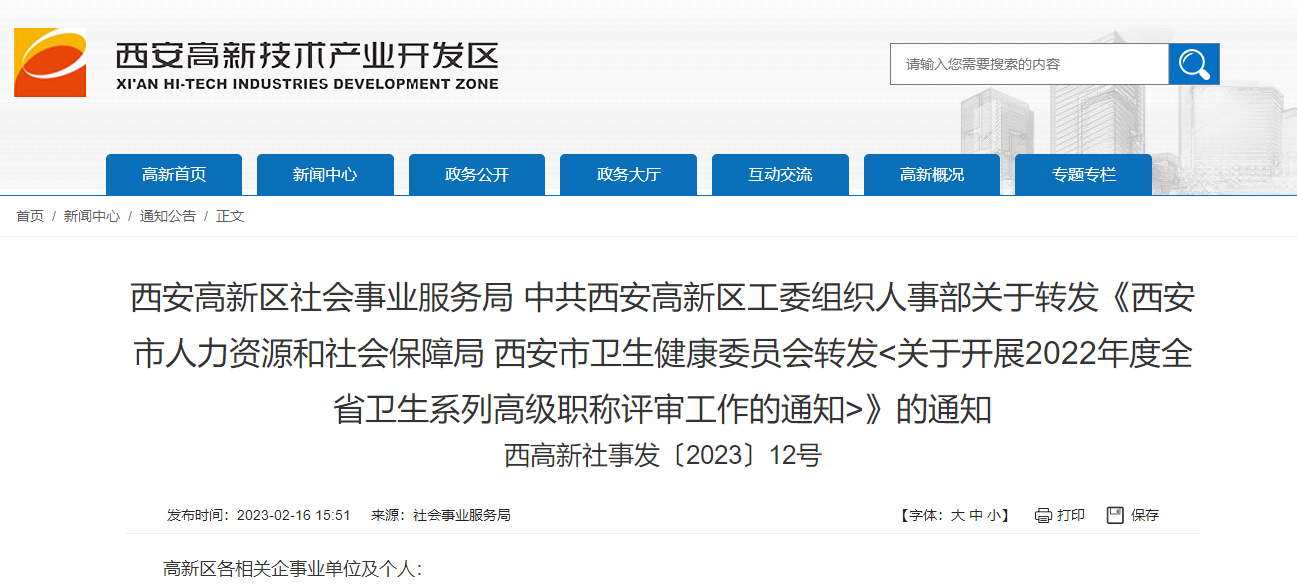 西安高新區(qū)關(guān)于開展2022年衛(wèi)生系列高級(jí)職稱評(píng)審工作的通知公布啦!醫(yī)學(xué)教育網(wǎng)整理具體內(nèi)容如下:
