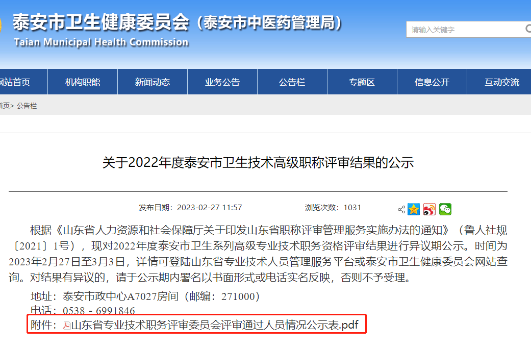 泰安市衛(wèi)生健康委員會(huì)發(fā)布關(guān)于2022年度泰安市衛(wèi)生技術(shù)高級(jí)職稱評(píng)審結(jié)果的公示,醫(yī)學(xué)教育網(wǎng)整理具體內(nèi)容如下:
