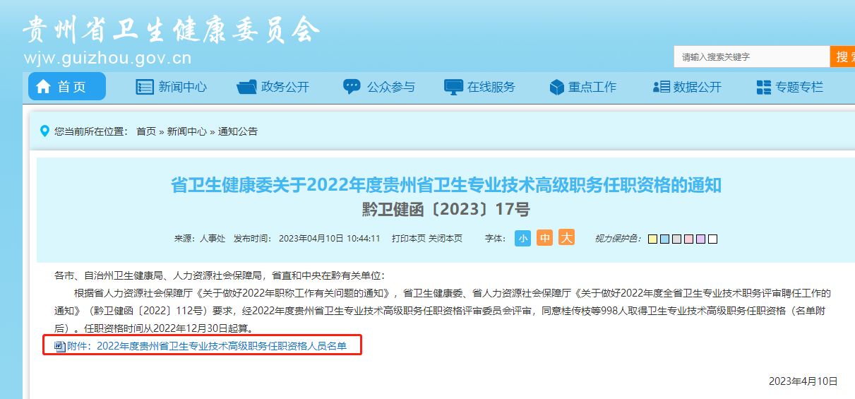 根據(jù)省人力資源社會(huì)保障廳《關(guān)于做好2022年職稱工作有關(guān)問題的通知》,省衛(wèi)生健康委、省人力資源社會(huì)保障廳《關(guān)于做好2022年度全省衛(wèi)生專業(yè)技術(shù)職務(wù)評審聘任工作的通知》(黔衛(wèi)健函〔2022〕112號)要求,經(jīng)2022年度貴州省衛(wèi)生專業(yè)技術(shù)高級職務(wù)任職資格評審委員會(huì)評審,同意桂傳枝等998人取得衛(wèi)生專業(yè)技術(shù)高級職務(wù)任職資格(名單附后)。任職資格時(shí)間從2022年12月30日起算。