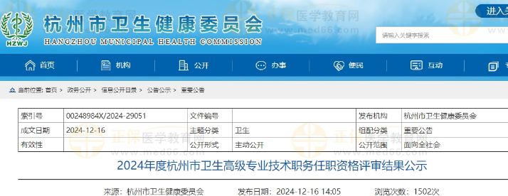 2024年度杭州市衛(wèi)生高級專業(yè)技術(shù)職務(wù)任職資格評審結(jié)果公示公布啦!醫(yī)學(xué)教育網(wǎng)整理具體內(nèi)容如下: