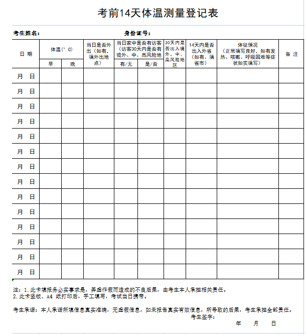 5.考試當(dāng)天,進(jìn)入考點(diǎn)時(shí)應(yīng)現(xiàn)場(chǎng)出示考試日前7天內(nèi)核酸檢測(cè)陰性證明(或我市考試期間具體規(guī)定)、“遼事通健康碼”、《考前14天體溫登記表》,并主動(dòng)配合工作人員接受體溫檢測(cè),體溫檢測(cè)確認(rèn)正常的(低于37.3℃)方可進(jìn)入考點(diǎn)參加考試,如發(fā)現(xiàn)體溫異常(≥37.3℃),需現(xiàn)場(chǎng)進(jìn)行體溫復(fù)測(cè)。