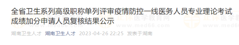 湖南衛(wèi)生人才發(fā)布:全省衛(wèi)生系列高級職稱單列評審疫情防控一線醫(yī)務人員專業(yè)理論考試成績加分申請人員復核結(jié)果公示,醫(yī)學教育網(wǎng)整理詳細內(nèi)容分享給大家了解!
