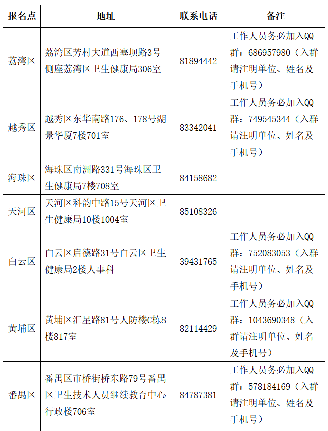 (1)以下單位單獨(dú)設(shè)立報(bào)名點(diǎn),受理本單位考生的現(xiàn)場確認(rèn):廣州市衛(wèi)健委各直屬單位、廣州市民政局系統(tǒng)、廣州醫(yī)科大學(xué)各附屬醫(yī)院、廣東省人民醫(yī)院、廣東省第二人民醫(yī)院、廣東省婦幼保健院、廣東省第二中醫(yī)院、廣東省疾病預(yù)防控制中心、廣東省職業(yè)病防治院、廣東藥科大學(xué)附屬第一醫(yī)院、廣東省工傷康復(fù)醫(yī)院、廣東三九腦科醫(yī)院、廣州新海醫(yī)院、中國人民解放軍南部戰(zhàn)區(qū)空軍醫(yī)院、武警廣東省總隊(duì)醫(yī)院、廣東省水電醫(yī)院、廣東江南醫(yī)院、廣州復(fù)大醫(yī)療有限公司復(fù)大腫瘤醫(yī)院、廣東省生殖醫(yī)院、南方醫(yī)科大學(xué)、廣州中醫(yī)藥大學(xué)。上述單位須提醒考生在報(bào)名時按工作單位名稱選擇對應(yīng)的報(bào)名點(diǎn),避免耽誤考試報(bào)名。