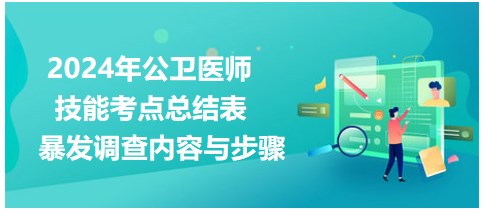2024公衛(wèi)醫(yī)師考生請(qǐng)注意!實(shí)踐技能考試備考進(jìn)入倒計(jì)時(shí),一定堅(jiān)持每日備考復(fù)習(xí)加深考點(diǎn)記憶!正保醫(yī)學(xué)教育網(wǎng)幫考生整理了2024公衛(wèi)醫(yī)師技能考點(diǎn)總結(jié)表-暴發(fā)調(diào)查內(nèi)容與步驟,趕快來背!