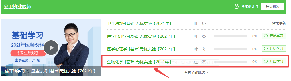 新課開(kāi)通!2021年公衛(wèi)執(zhí)業(yè)醫(yī)師考試莊嚴(yán)老師《生物化學(xué)》基礎(chǔ)學(xué)習(xí)班新課開(kāi)啦!已購(gòu)課同學(xué)可以直接進(jìn)入我的網(wǎng)校我的家-我的課程-生物化學(xué)科目進(jìn)行學(xué)習(xí)!2021年公衛(wèi)執(zhí)業(yè)醫(yī)師生物化學(xué)考試大綱無(wú)變動(dòng),2021年新教材有部分變動(dòng)。具體內(nèi)容下方查看。未購(gòu)課學(xué)員點(diǎn)擊此處進(jìn)入選擇,具體看課位置如下: