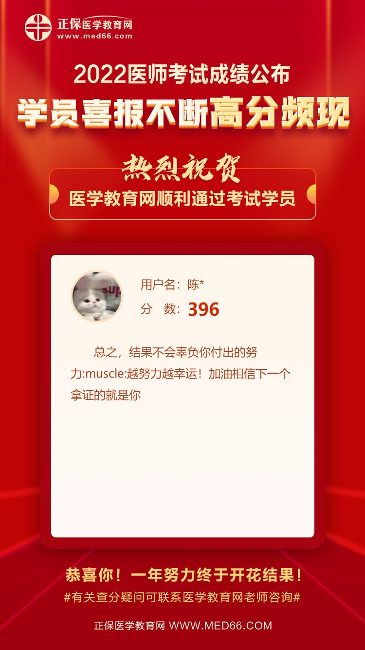 2022年醫(yī)師資格考試成績公布后,醫(yī)學教育網(wǎng)學員喜報不斷,高分頻現(xiàn)!在此醫(yī)學教育網(wǎng)小編熱烈祝賀各位順利通過考試的同學!同時也將大家成功的喜悅、備考心得一起分享給2023年考生。一起來看看吧!