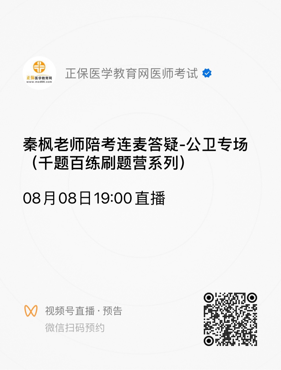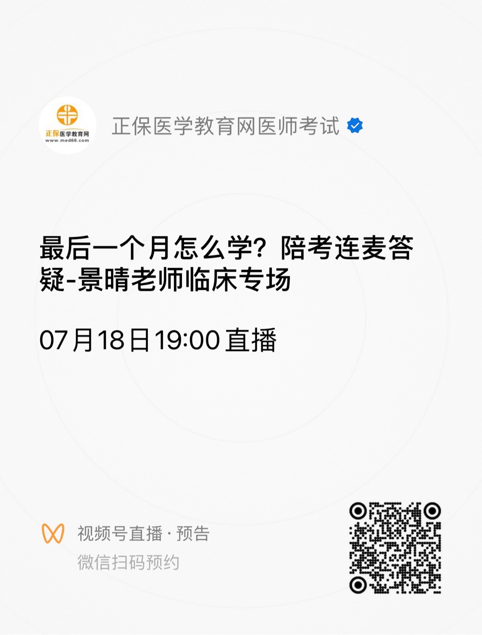 關(guān)注微信視頻號(hào)"正保醫(yī)學(xué)教育網(wǎng)醫(yī)師考試",可以掃碼直接預(yù)約直播。直播當(dāng)天會(huì)收到開(kāi)播提醒,在直播間直接申請(qǐng)連麥與老師暢談。