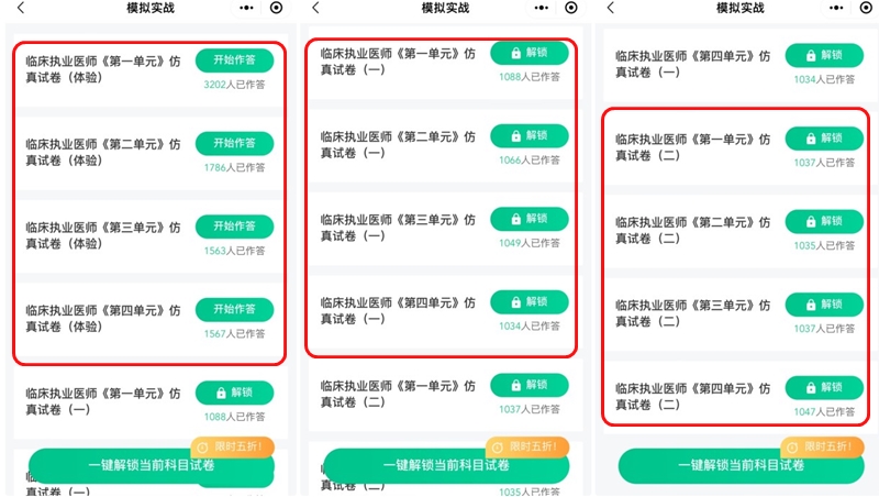 試卷(一)需付費解鎖,執(zhí)業(yè)四個單元合計600題,助理兩個單元合計300題;
