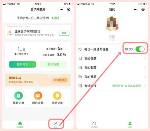 想要每天堅(jiān)持打卡,但是一忙起來(lái)總忘?想要督促自己每日必須完成打卡內(nèi)容?點(diǎn)擊“我的”,打開(kāi)“每日一練通知提醒”就可以解決啦!考生可以根據(jù)自己的工作休息時(shí)間自行設(shè)置打卡提醒時(shí)間。