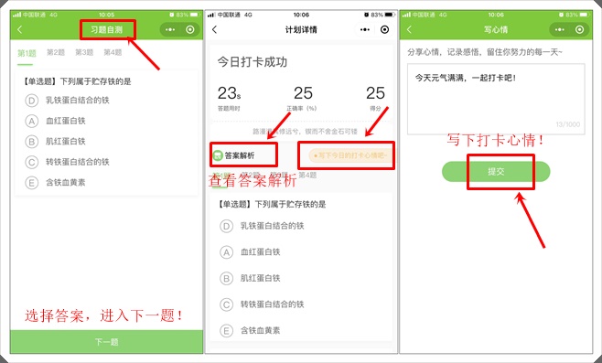 (3)查看測試結果+答案解析+分享今日打卡心情,提交完成打卡