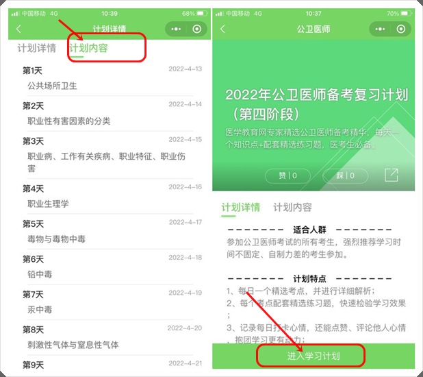 如公衛(wèi)醫(yī)師備考復習計劃(第四階段),然后點擊下方“加入計劃 開始學習”按鈕,開始正式進入打卡學習。