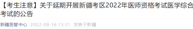 為切實做好我區(qū)新冠肺炎疫情防控工作,確保廣大考生和考試工作人員的生命安全和身體健康,新疆考區(qū)決定延期開展原定于8月19日至21日的2022年醫(yī)師資格考試醫(yī)學綜合考試,具體時間另行通知。