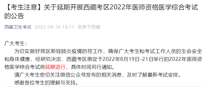 為切實做好我區(qū)新冠肺炎疫情防控工作,確保廣大考生和考試工作人員的生命安全和身體健康,經研究決定,西藏考區(qū)原定于2022年8月19日-21日舉行的2022年醫(yī)師資格醫(yī)學綜合考試將延期進行,具體時間另行通知。