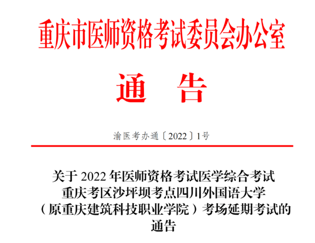 相關通知:2022年醫(yī)師資格考試醫(yī)學綜合考試重慶考區(qū)沙坪壩考點四川外國語大學考場延期考試的通告