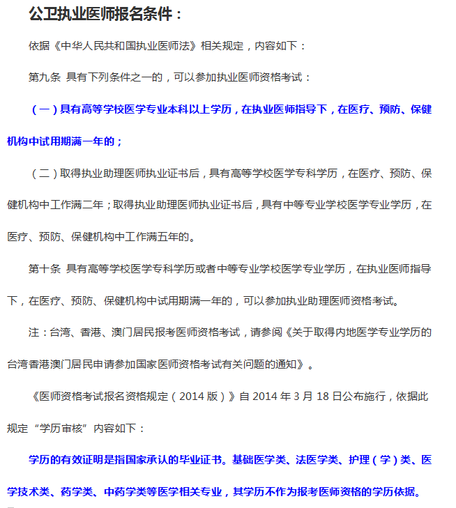 3.專升本醫(yī)學(xué)本科畢業(yè)生,2015年9月1日以后升入本科的,其專業(yè)必須與專科專業(yè)相同或相近,其本科學(xué)歷方可作為報考醫(yī)師資格的學(xué)歷依據(jù)。