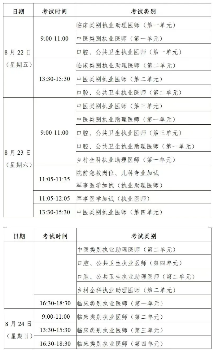 2025年繼續(xù)開展醫(yī)師資格考試臨床類別、中醫(yī)類別具有規(guī)定學歷中醫(yī)醫(yī)學綜合考試“一年兩試”試點。在安徽考區(qū)已報考當年醫(yī)師資格考試,實踐技能考試合格成績在有效期內(nèi),未通過第一次醫(yī)學綜合考試且無違紀違規(guī)行為的考生,和第一次醫(yī)學綜合考試缺考及未繳納考試費的考生,可報名參加第二次醫(yī)學綜合考試,考試時間如下: