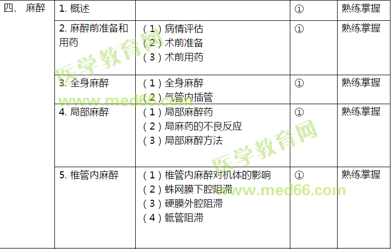 二、 外科輸血 | (1)輸血的適應(yīng)證 (2)輸血反應(yīng)、并發(fā)癥及其防治 (3)成分輸血 (4)自身輸血 | ① | 熟練掌握 | |