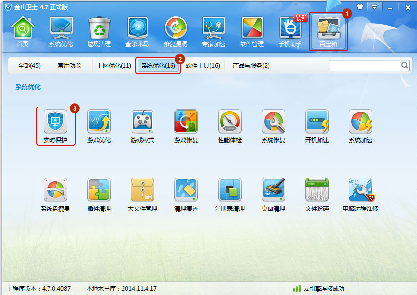 第一步:打開金山衛(wèi)士主界面,點擊“百寶箱”選項卡,選擇“系統(tǒng)優(yōu)化”,點擊“實時保護”。
