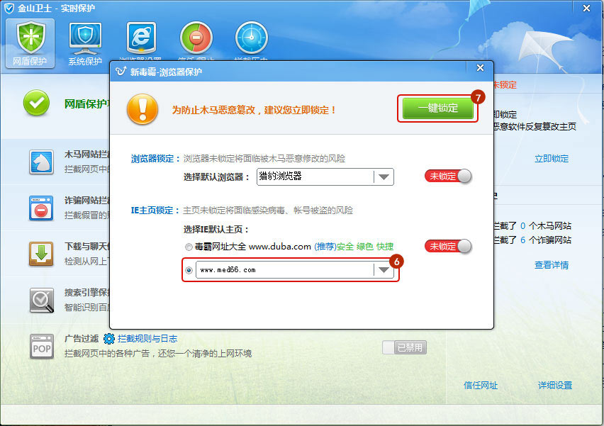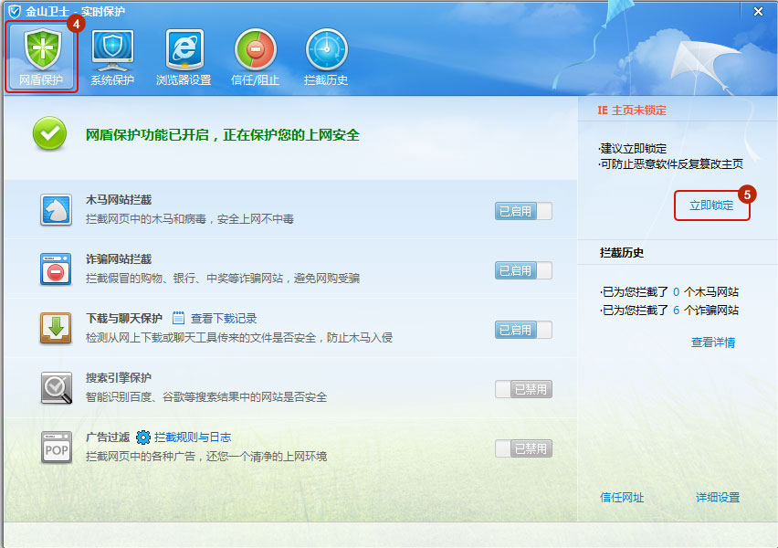 第二步:打開“網(wǎng)盾保護”選項卡,點擊右方“立即鎖定”。