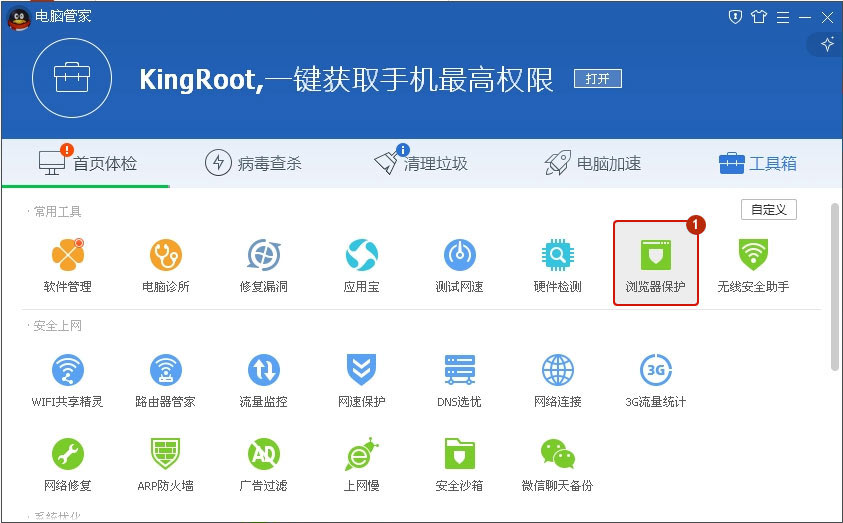 第一步:打開QQ電腦管家首頁,點擊“工具箱”中的“瀏覽器保護”。
