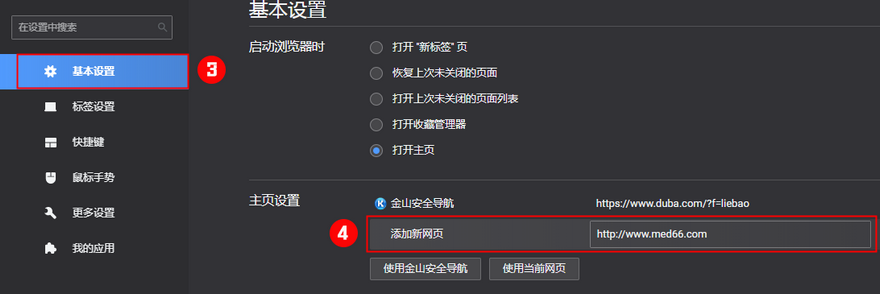 第二步:基本設(shè)置-主頁設(shè)增加新網(wǎng)頁,輸入http://m.tymfj.cn即可。