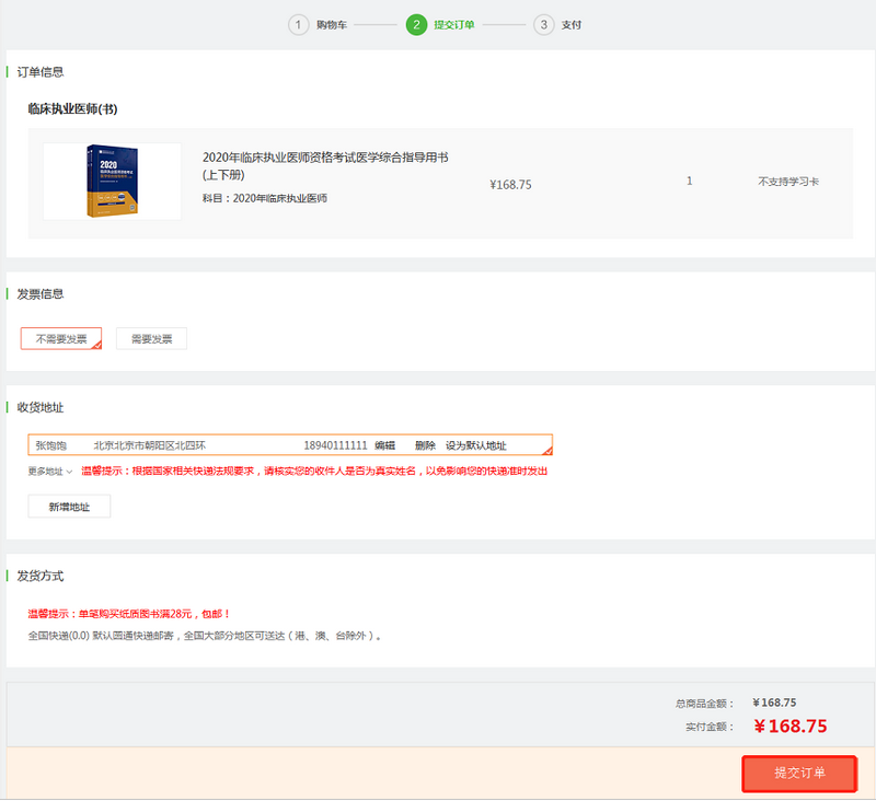 第三步:詳細(xì)填寫收貨人信息、發(fā)票信息、配送方式等信息,確認(rèn)訂單無誤后,點(diǎn)擊“提交訂單”。