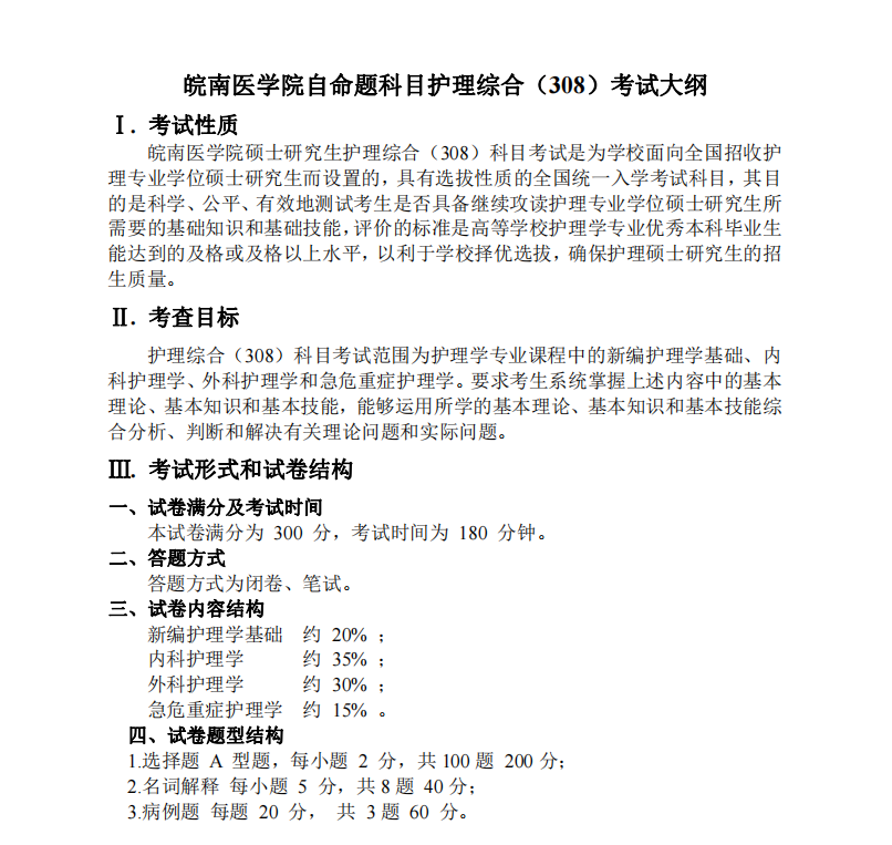 皖南醫(yī)學(xué)院自命題科目護(hù)理綜合(308)考試大綱