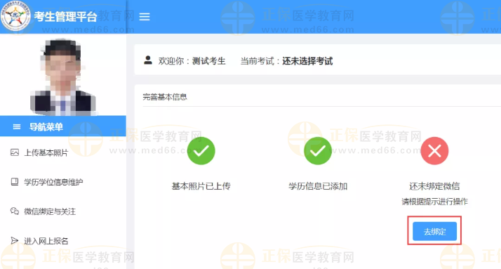 注冊完成登錄網(wǎng)上報名系統(tǒng)后,按照頁面提示進行上傳基本照片、維護學(xué)歷學(xué)位信息和綁定微信操作。