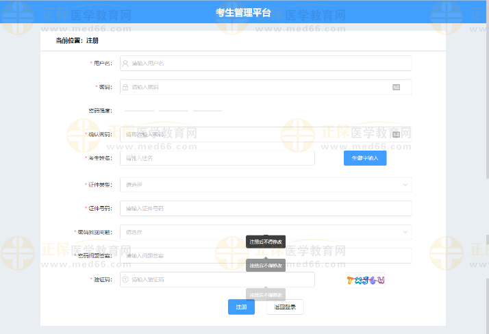 3、注冊成功后,考生應(yīng)牢記用戶名、密碼和密碼找回問題、答案,它們是找回密碼操作的唯一途徑。